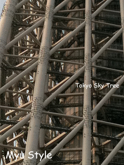 東京スカイツリー公式サイト>>アシンメトリーな構造をしています。太い柱の間に無数の細い柱が斜めに張られています。望遠レンズでじっと見ていると近未来の施設にいるような異様な感覚になります。