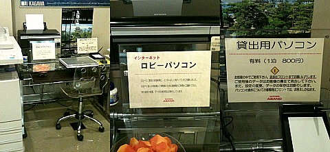 部屋にはLANが全室設置部屋のデスクにはLANがついてあります(もはや今では当たり前かな)。ロビーには無料で使えるA4ノートパソコンも設置。もしPC持たずに身軽に来ても一晩800円でレンタルできます。3台用意があるとのことです。