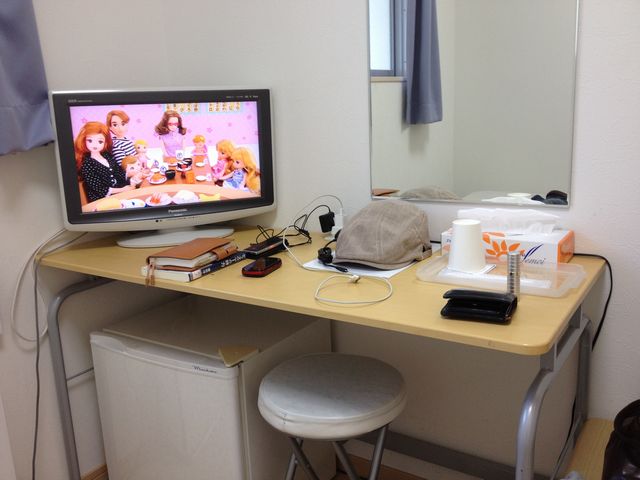 デスクもIKEAで買ってきて組み立てたようなシンプルなもの。テレビは液晶20インチかな?