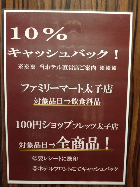 外での買い物はファミリーマートが近くて便利。100mほどです。しかもそのファミマがホテルと同じ経営です。フロントでレシートを提示するとなんと10%キャッシュバックしてもらえます。