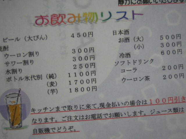 1階の玄関隣には、居酒屋があります。夕食は部屋へ200円でルームサービスしてくれますが、お店で食べる(飲む)ほうがいいですよ。地元の漁師のおっちゃんとかも来ますし、おすすめです。民宿建物内からいけるので、浴衣でもOKです。